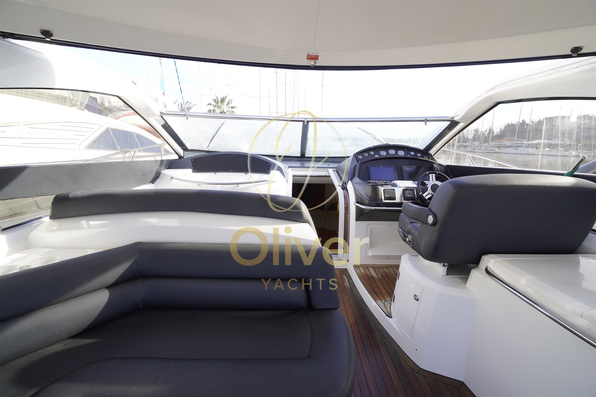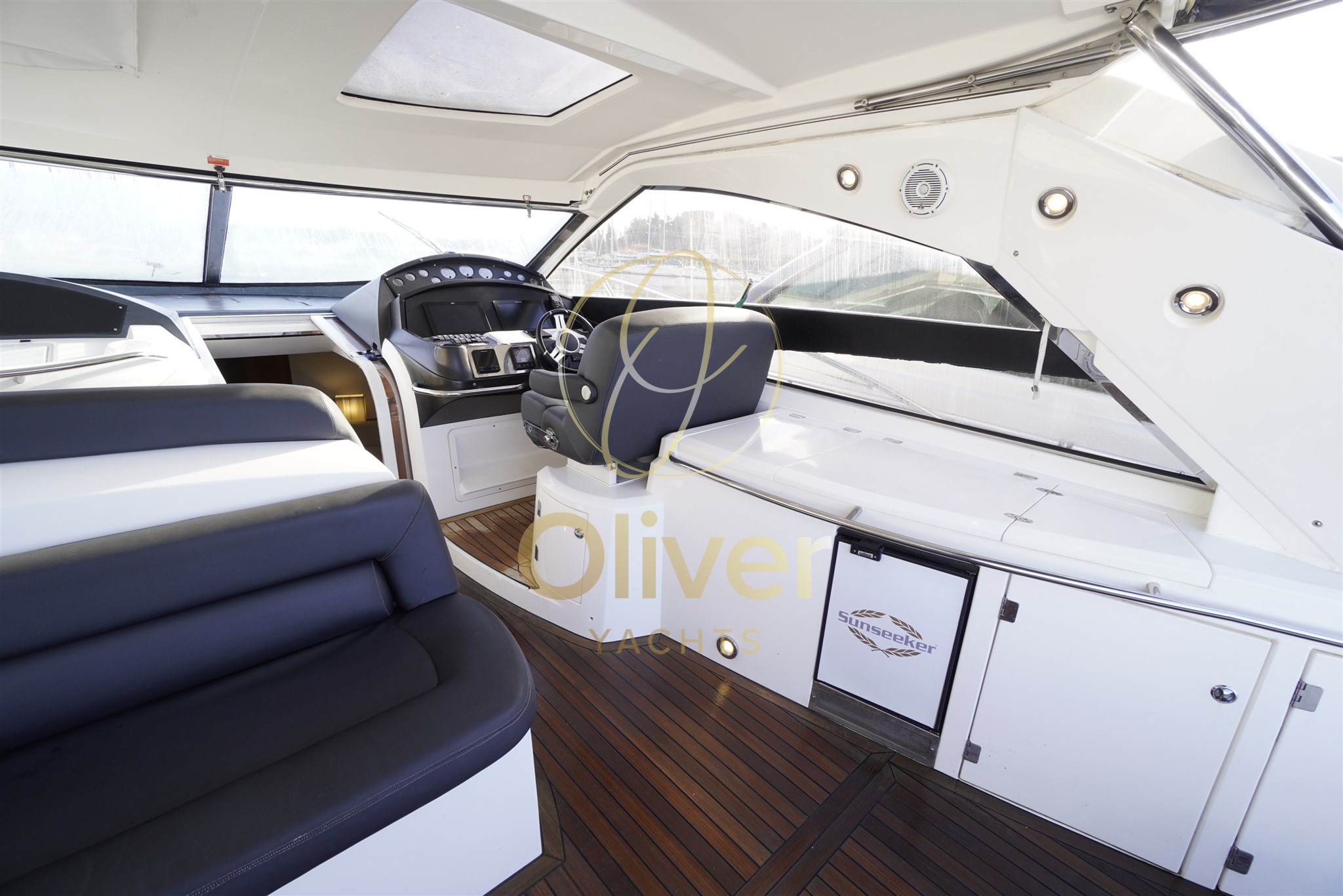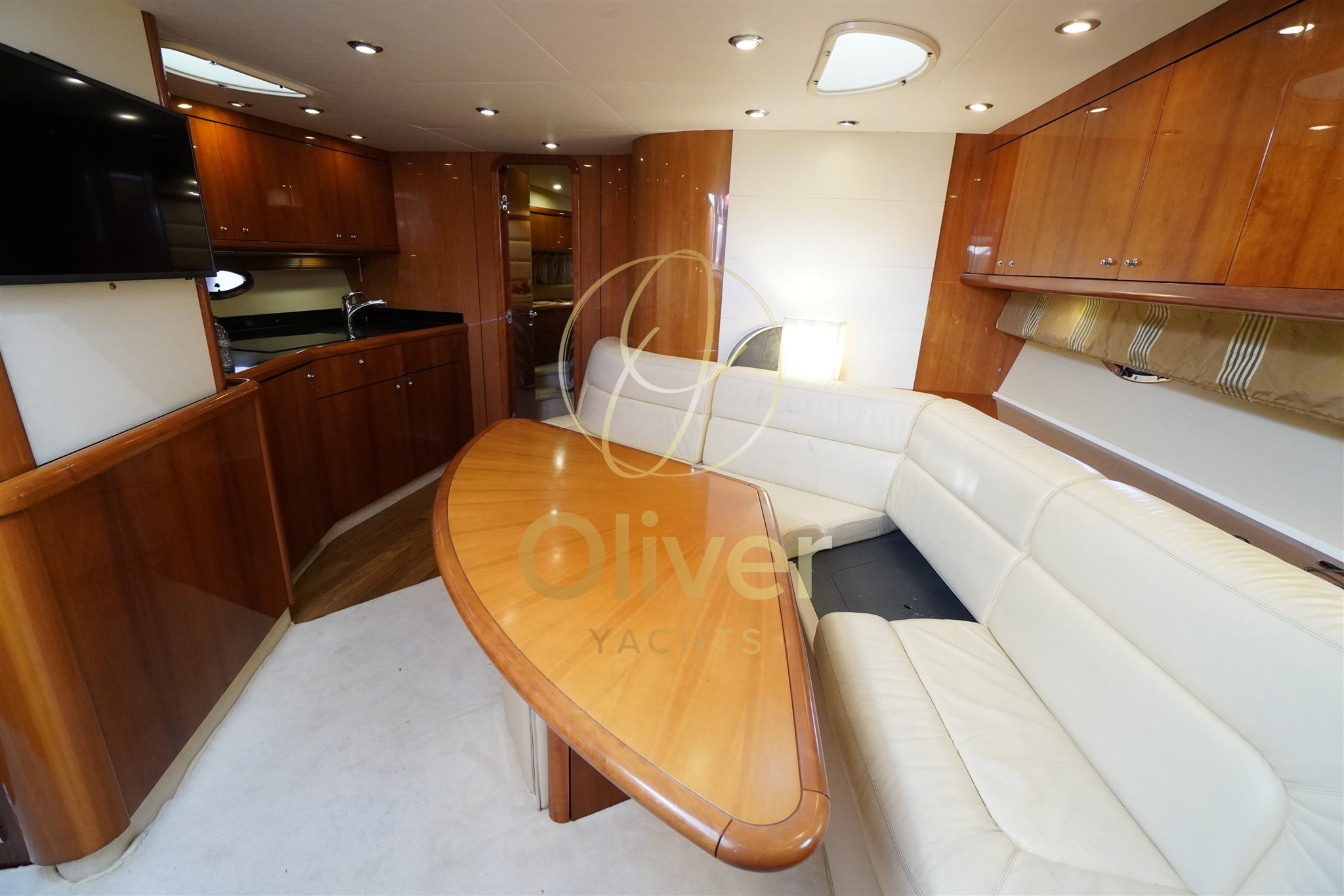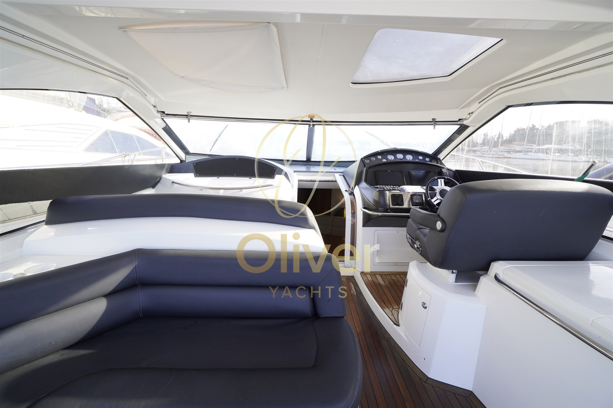 Gli interni del Sunseeker Portofino 53 riflettono pienamente la filosofia del brand: eleganza sobria, materiali marini di qualità e spazi ben sfruttati. La struttura è realizzata in compensato marino, sinonimo di robustezza e durata nel tempo, ideale per un utilizzo armatoriale continuativo.