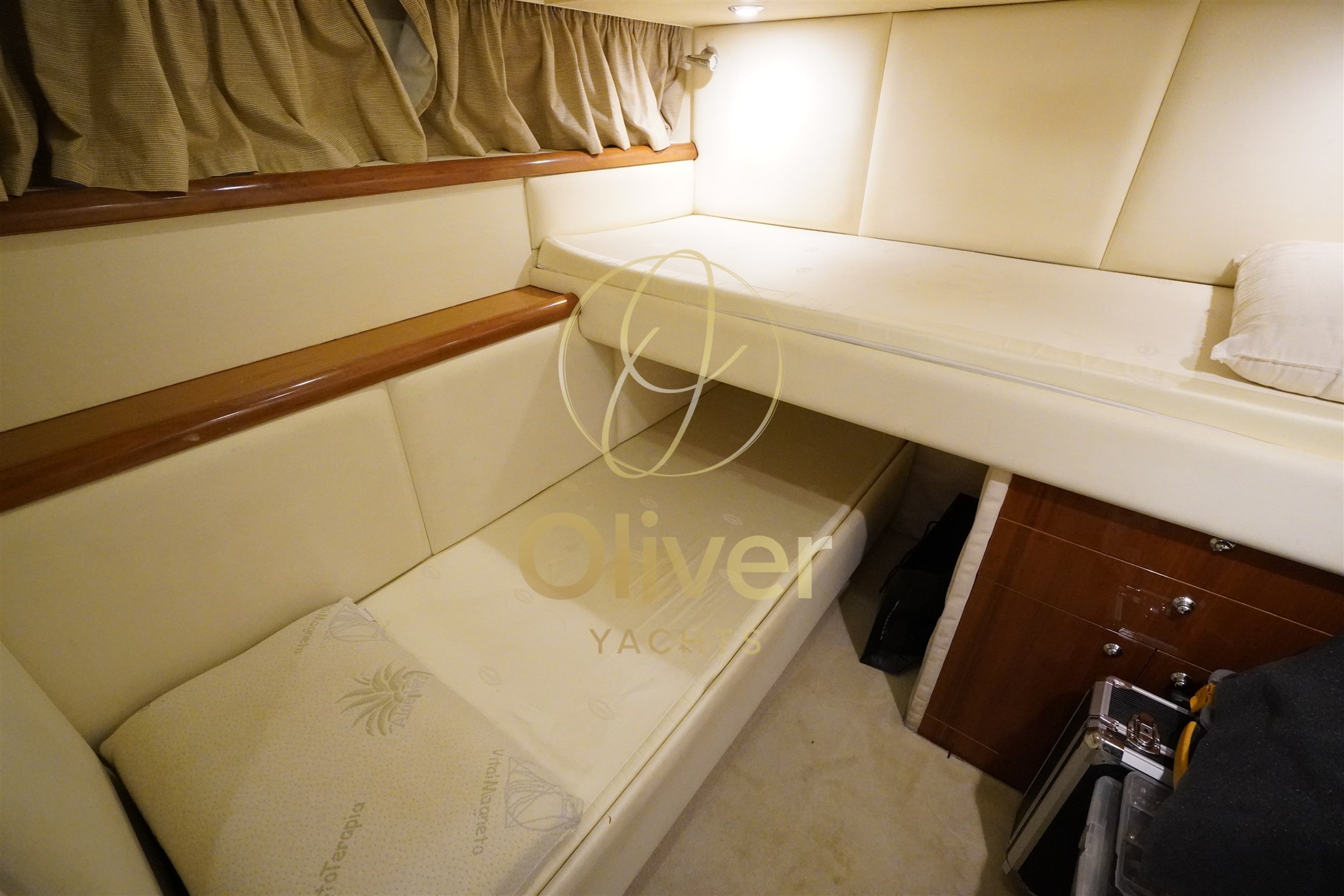 Il layout prevede 3 cabine e 2 bagni, una configurazione estremamente ricercata su un open di questa lunghezza. La cabina armatoriale è ampia, luminosa e dotata di bagno privato, offrendo comfort e privacy paragonabili a imbarcazioni di categoria superiore. Le due cabine ospiti sono ben dimensionate e servite dal secondo bagno, rendendo la barca perfetta anche per crociere con famiglia o amici.