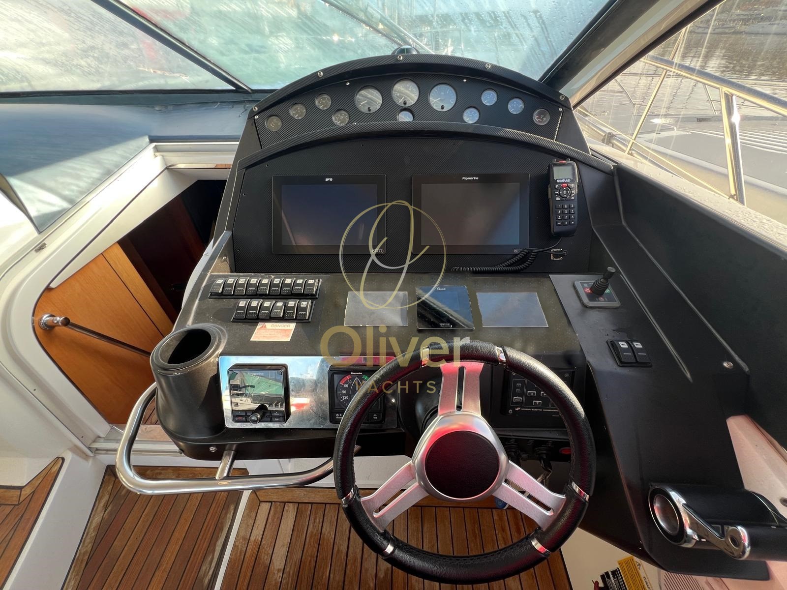 Angolo barra, Antenna radar, Bussola, Comando motori elettronico, Computer di bordo, Contametri catena, Contamiglia, Cronometro, Display, DSC vhf, Ecoscandaglio (SIMRAD), GPS, Log, Luci di navigazione, Mappe e guide, Pilota automatico (SIMRAD), Plotter, Plotter con antenna GPS, Quadro comandi, Radar, Radio VHF, Sedile Copilota, Strumenti di misura per motori.